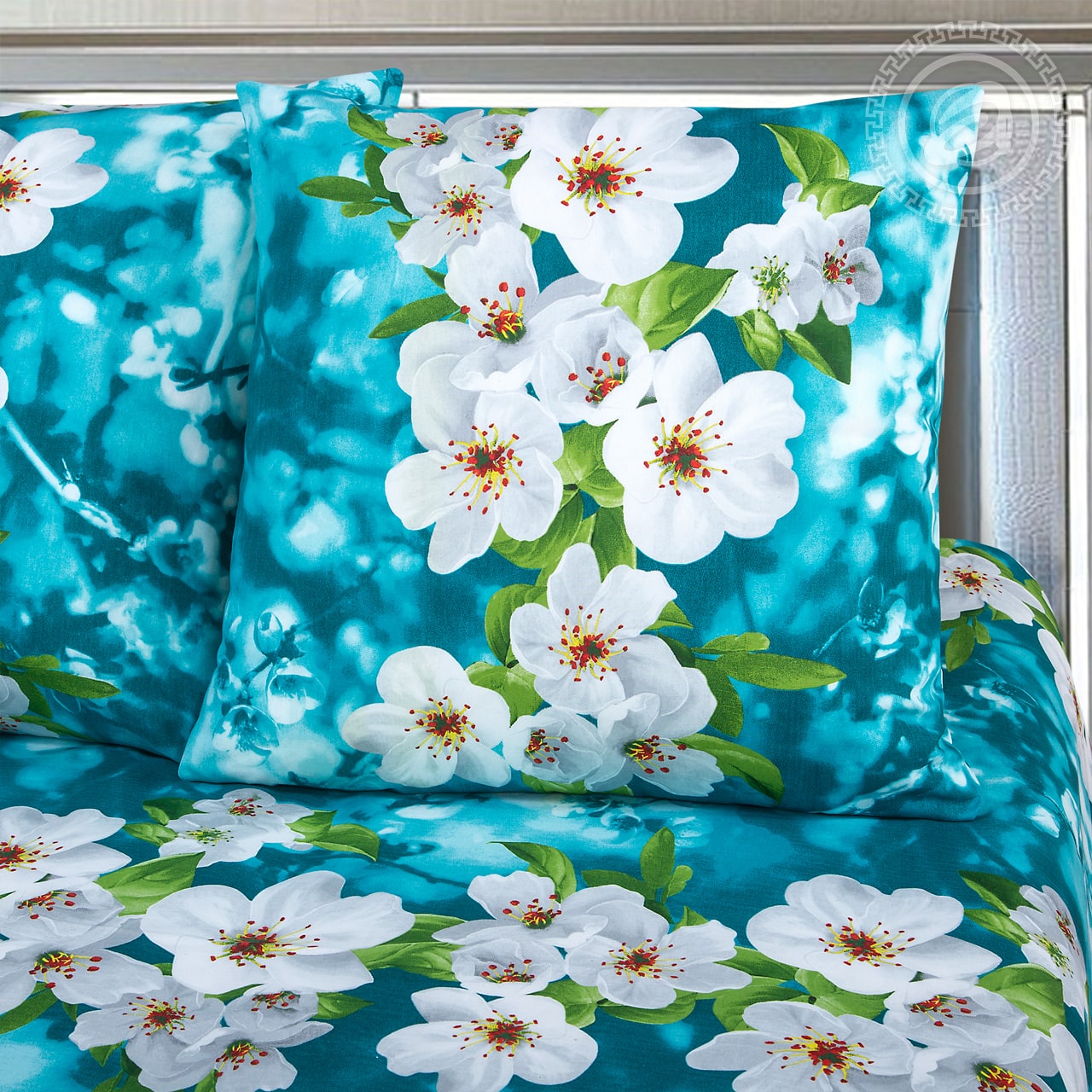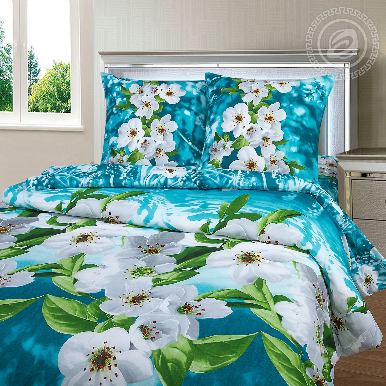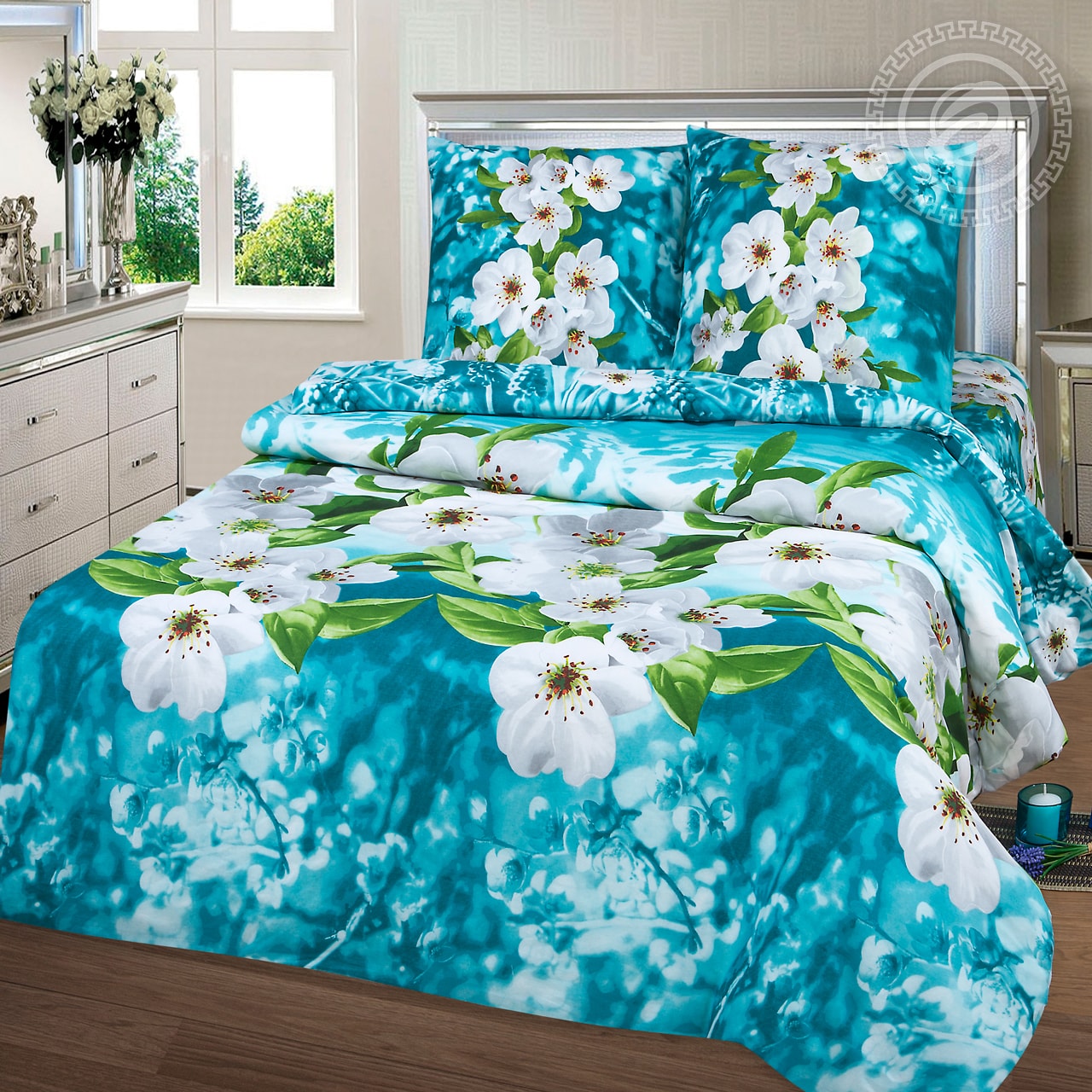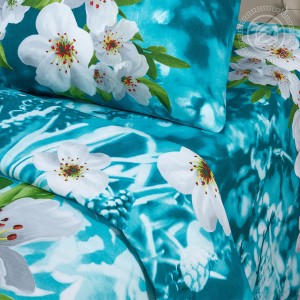 Стильная композиция с крупными рисунками белоснежных цветов весенней вишни станет вашей любимой. Приятный голубой фон, переливы оттенков, зеленые листики – все создает настроение, ощущение обновления, дает вдохновение. Изделие подчеркнет стиль любой спальни. В состав входит 100% хлопок. Натуральная ткань отлично пропускает воздушные массы, является безопасной и гипоаллергенной. Материал приятный и комфортный на ощупь, поможет мгновенно расслабиться и хорошо отдохнуть.