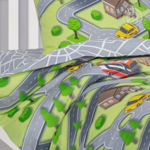 На ткани бязь оптом настоящий город с зеленеющими деревьями и асфальтированными дорогами. А по шоссе едут легковые машины, грузовики и автобусы. Рисунок выполнен в ярких цветах.