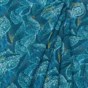 «Эйва» - название нового рисунка на плательной ткани, созданного художниками специально для романтических натур. На ткани видны листья, использован в основном изумрудный цвет. И лишь золотистые отблески подчеркивают необычайную красоту композиции. Ткань привлекает взор многих за счет своей плотности, а необычный рисунок с летящими листьями гипнотизирует и зачаровывает. Волшебство в каждом прикосновении.