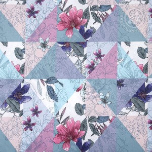 Постельное белье пэчворк всегда в тренде. С давних времен оно пользуется популярностью и является оригинальным декором интерьера. На комплекте из поплина интересный принт, который выполнен в стилистике лоскутной мозаики. Здесь ромбы, словно лоскутки, соединены между собой. Все фигуры в нежных тонах и украшены изящными лепестками.