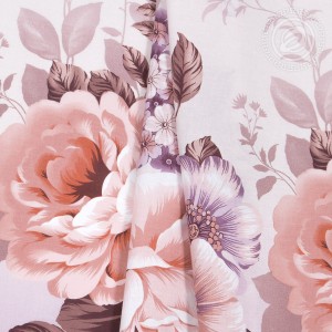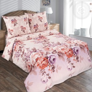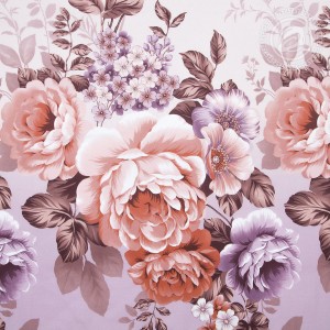 Фон рисунка «Карамельная роза» решен через плавный переход и слияние бежевого и очень светлого сиреневого оттенков. Центр композиции составляют крупные бутоны цветущих роз в обрамлении листьев, соцветий шиповника, примул и гортензий.