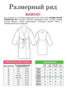 Халаты изготовлены из вафельного крупноузорчатого полотна "Итальянского дизайна", предназначены не только для домашнего применения, но и прекрасно подходят для бань, гостиниц, саун и SPA-салонов. Они долговечны и не садятся после многократных стирок, сохраняя первоначальную форму и вид. Легкие и приятные к телу, прекрасно впитывают влагу, позволяя коже дышать.