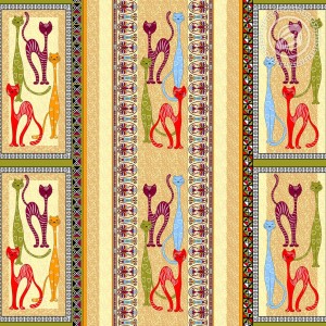 В рисунке затейливая геометрия орнаментов, заключенных в широкие бордюры, подчеркивает плавную грацию ярких стилизованных кошек. Песочный цвет, удачно объединяющий все оттенки рисунка, напоминает о золотых песках и загадочных кошках Древнего Египта, хранивших домашний очаг и почитаемых наравне с божествами.