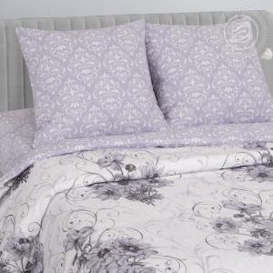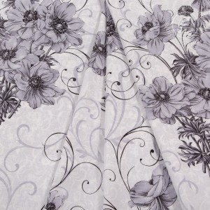 Светло-серый, серебристый, молочно-белый цвета составляют основную гамму рисунка «Лунная соната». Дымчатый белый фон будто выткан некрупным ажурным цветочным орнаментом более светлого оттенка. Средний план композиции составлен из светло-серых виньеток, делающих более органичным переход к основным принтам. Их роль играют крупные букеты цветущих маков.