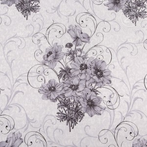 Светло-серый, серебристый, молочно-белый цвета составляют основную гамму рисунка «Лунная соната». Дымчатый белый фон будто выткан некрупным ажурным цветочным орнаментом более светлого оттенка. Средний план композиции составлен из светло-серых виньеток, делающих более органичным переход к основным принтам. Их роль играют крупные букеты цветущих маков. У рисунка есть компаньон со сплошным растительным орнаментом, выполненный в бело-серой гамме.