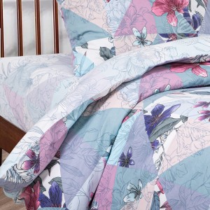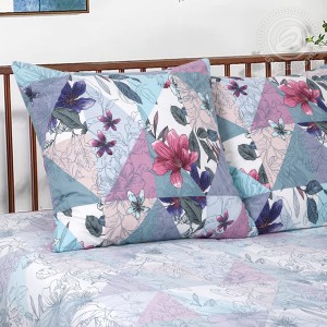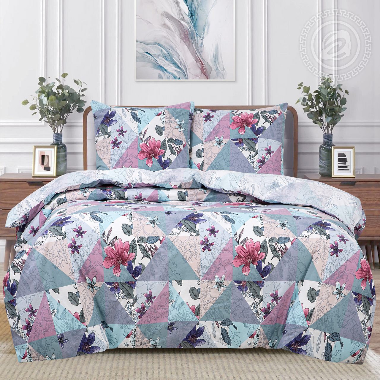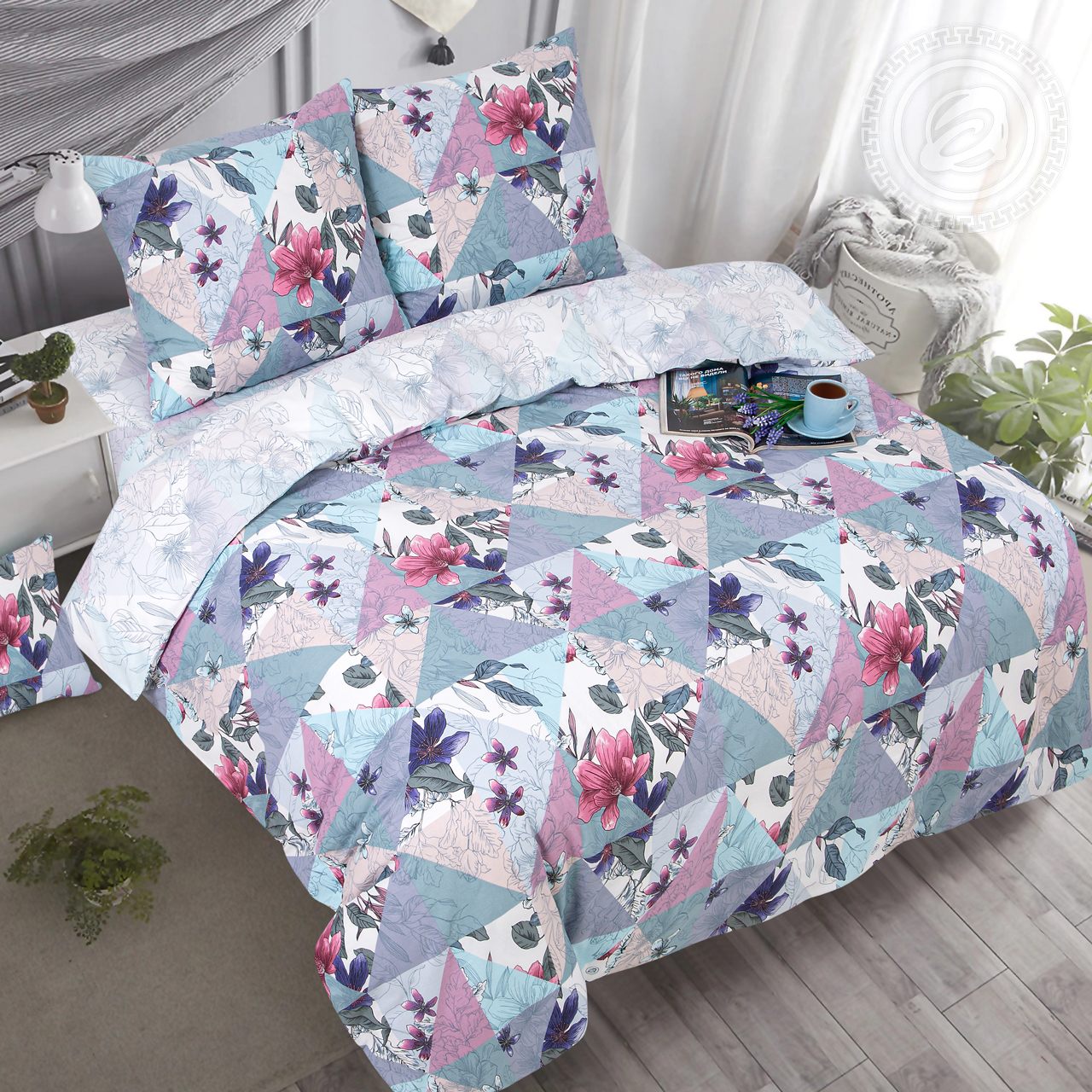 Постельное белье пэчворк всегда в тренде. С давних времен оно пользуется популярностью и является оригинальным декором интерьера. На комплекте из поплина интересный принт, который выполнен в стилистике лоскутной мозаики. Здесь ромбы, словно лоскутки, соединены между собой. Все фигуры в нежных тонах и украшены изящными лепестками.