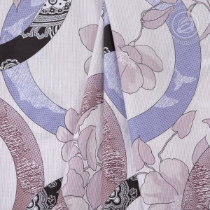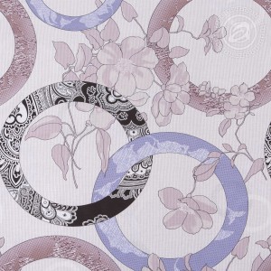 Кремовый фон рисунка «Мелодия» не плотно заполнен крупными кольцами, каждое из которых отличается собственным орнаментом. В дизайне колец используются три основных цвета – черный, бледно-васильковый и темно-коралловый. Соответственно принты на поверхности колец решены в белом цвете или более светлых оттенках основных цветов. Композицию дополняют декоративные бутоны в стиле «модерн» приглушенного пастельно-розового цвета. У рисунка есть темно-коралловый компаньон с принтом из менее крупных колец.