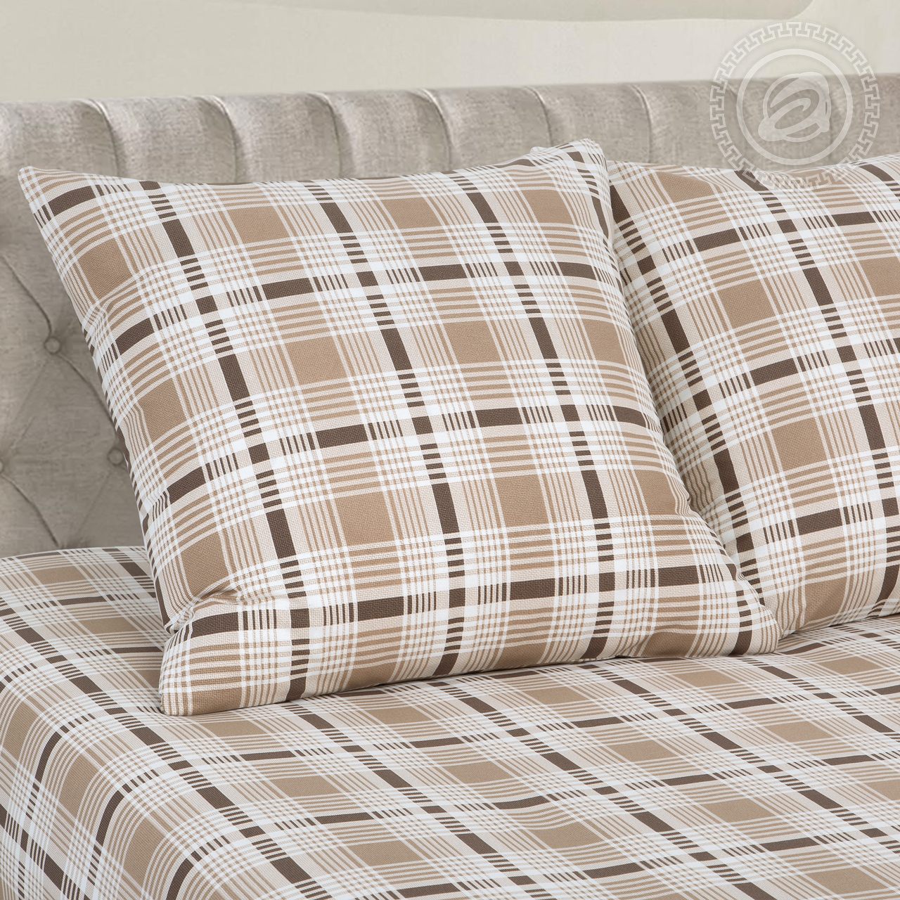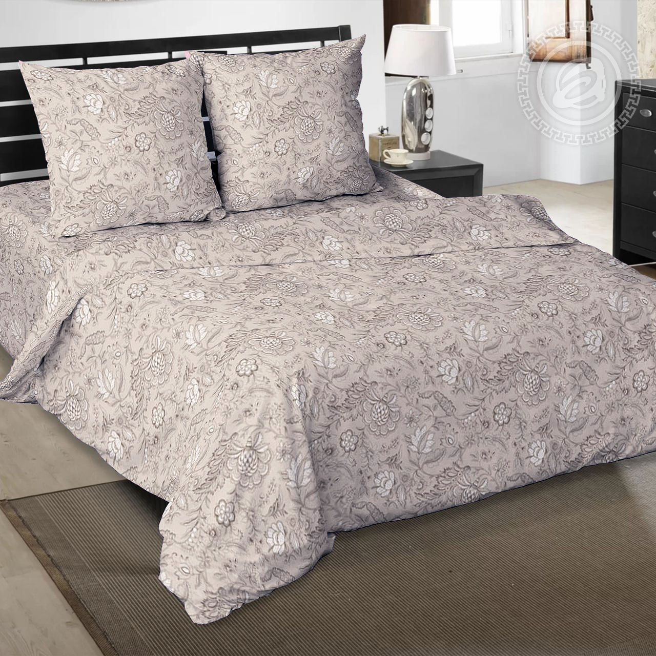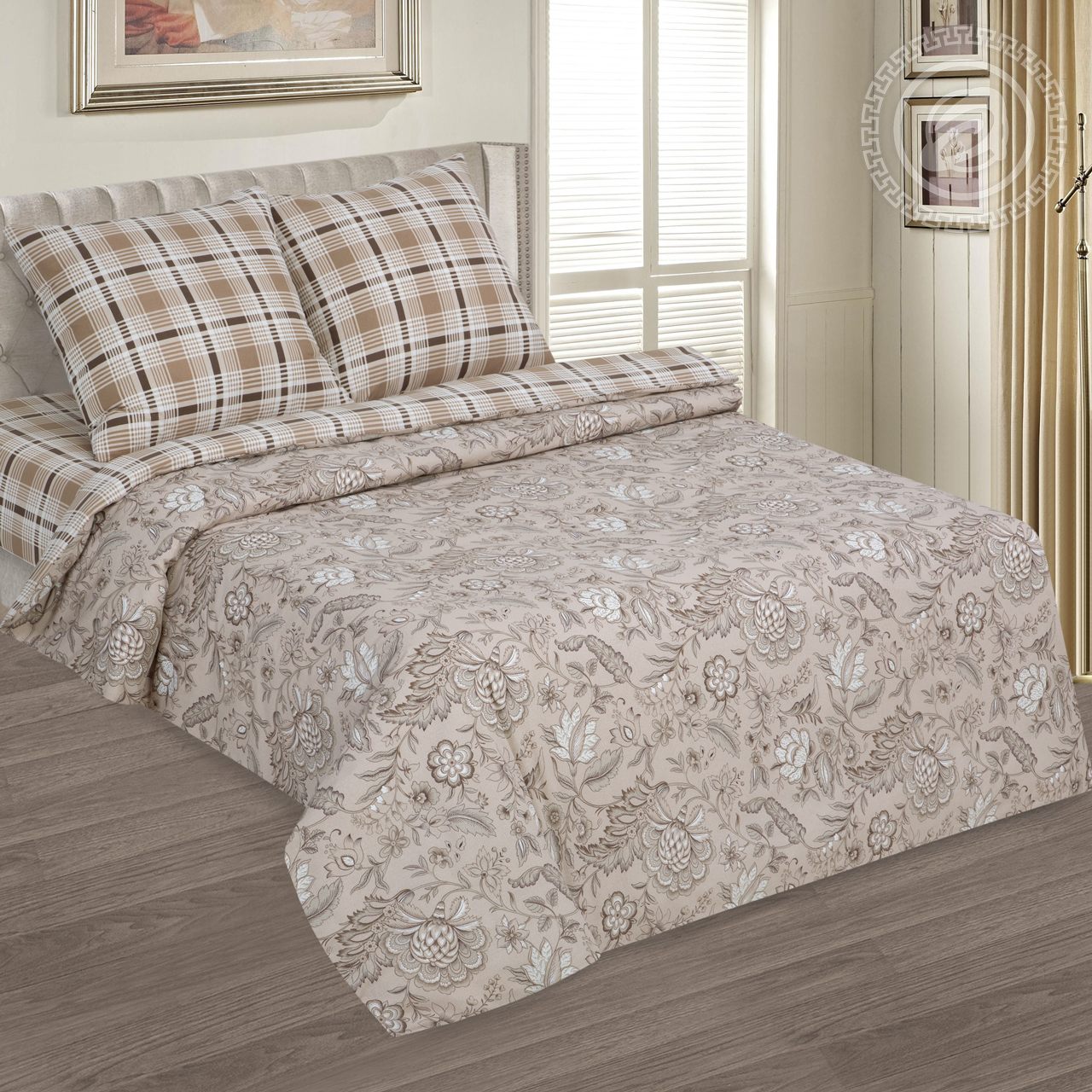 Жемчужно-бежевый фон рисунка «Ода» усыпан достаточно плотным и крупным растительным орнаментом. По своей фактуре он напоминает фантастические цветы, стебли и листья, украшающие изделия русских традиционных промыслов. Однако используемая цветовая гамма очень близка к фоновому цвету и яркие краски не отвлекают внимание от затейливой игры созданных художником узоров. У рисунка есть компаньон с «клетчатым» орнаментом в очень близкой, но более теплой цветовой гамме.