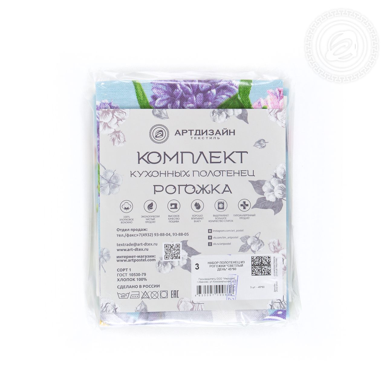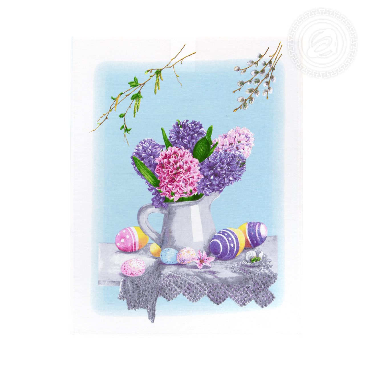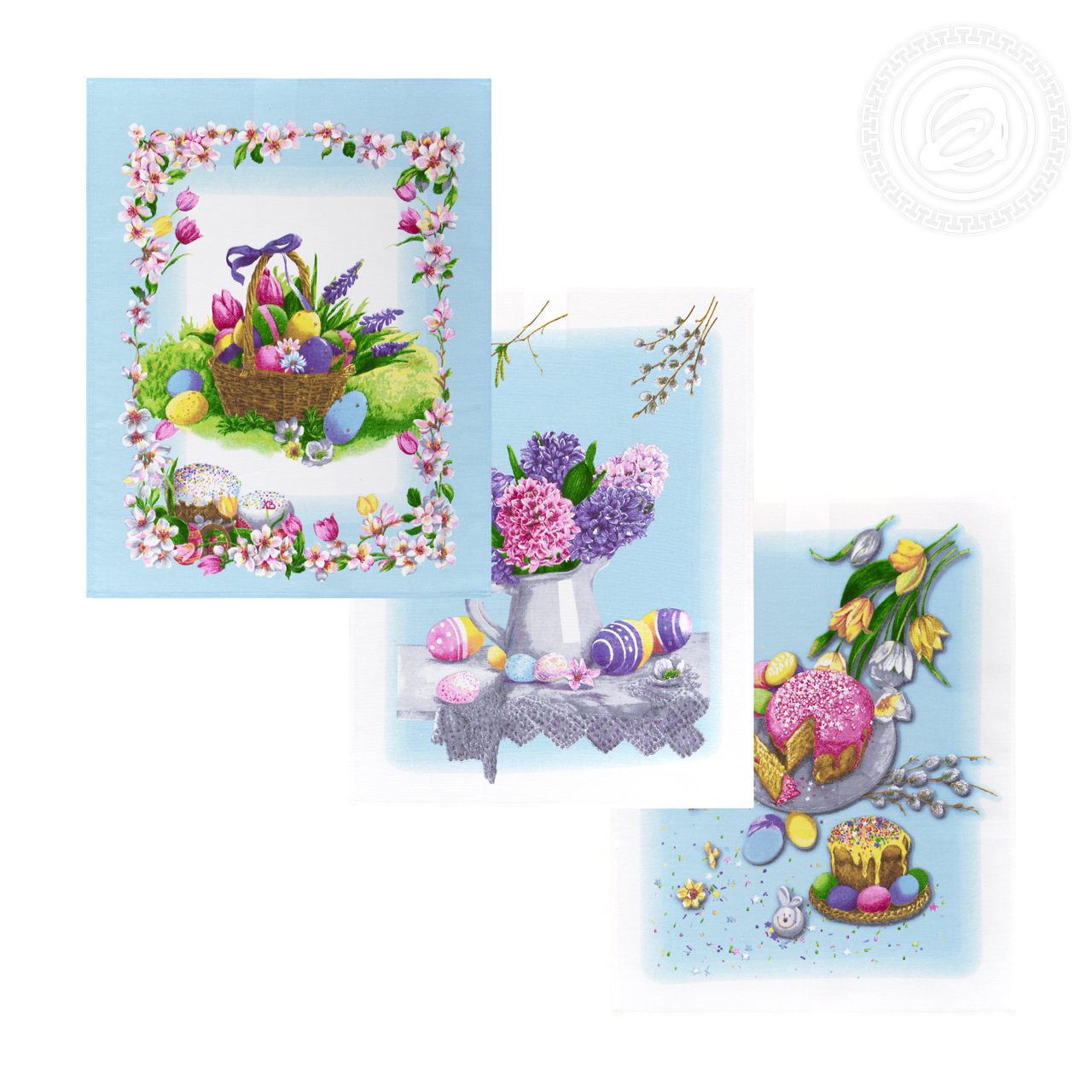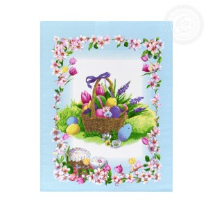 Изделия из ткани рогожка «Светлый день» украшены тематическим пасхальным декором. Разноцветные куличи, яички в корзинах с бантиками, веточки вербы, - композиция выглядит уютно и празднично. Помимо традиционных угощений на рисунке много весенних цветов.