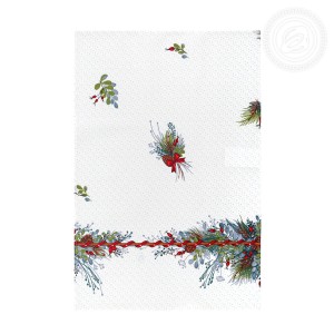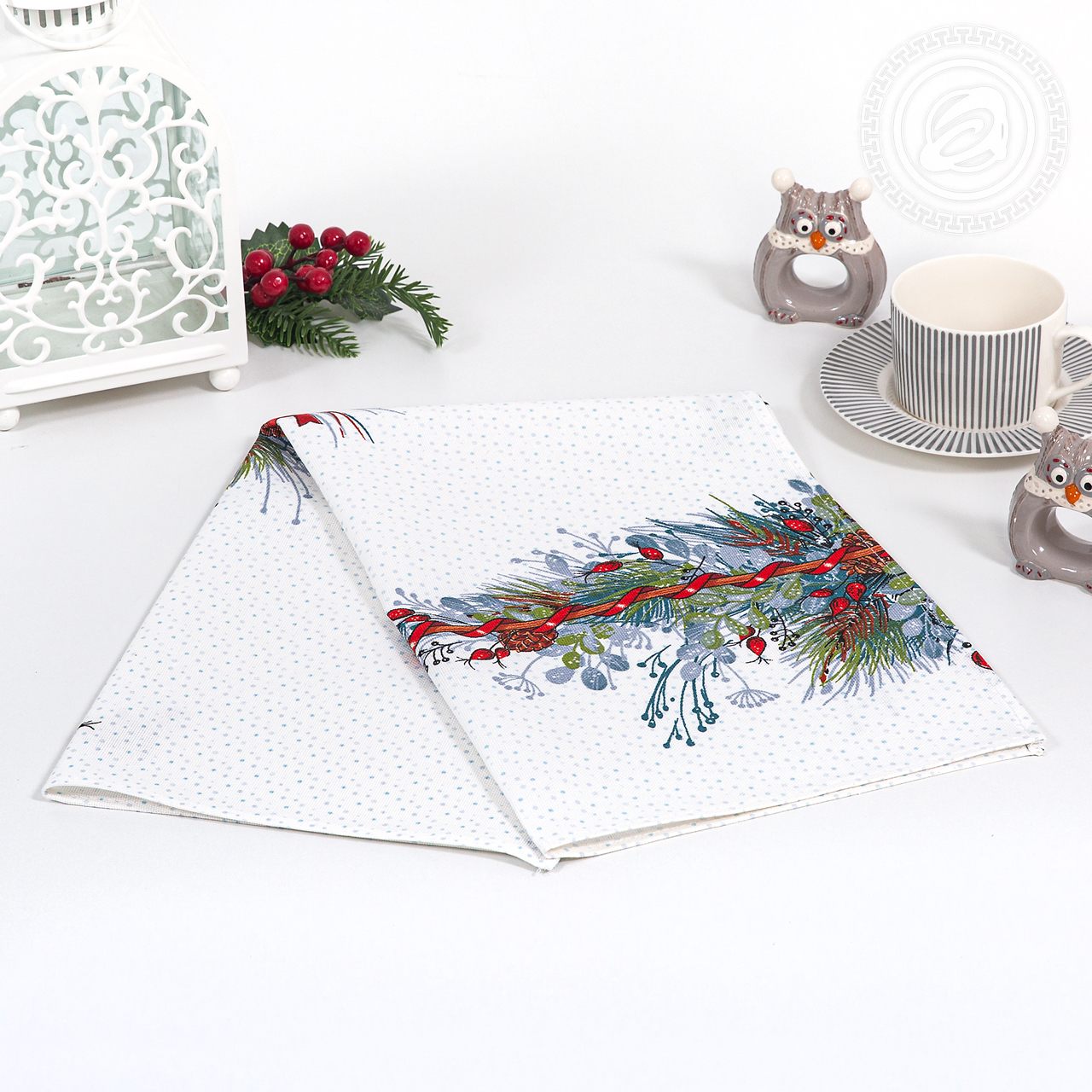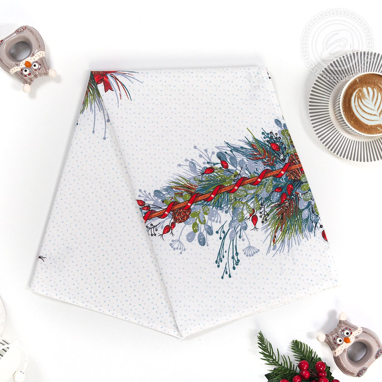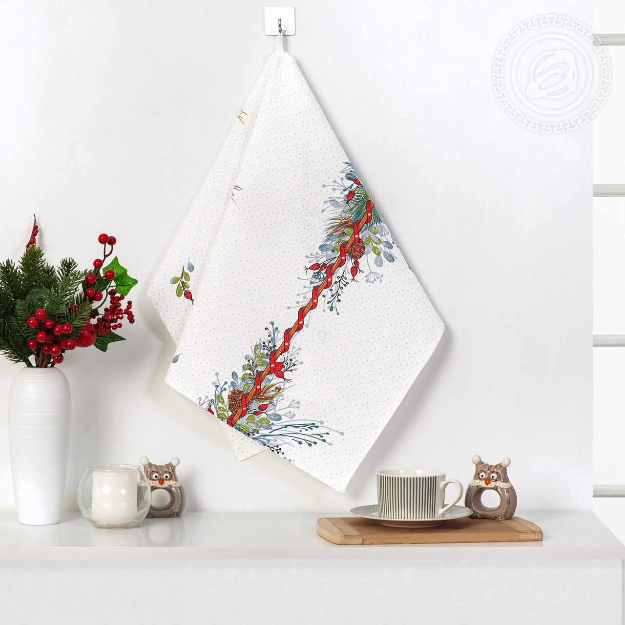 «Антураж» – новогоднее полотенце из рогожки с оригинальными деталями. Композиция включает в себя все праздничные элементы: еловые веточки с красными лентами, шишками и ягодами.