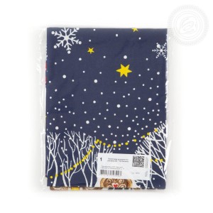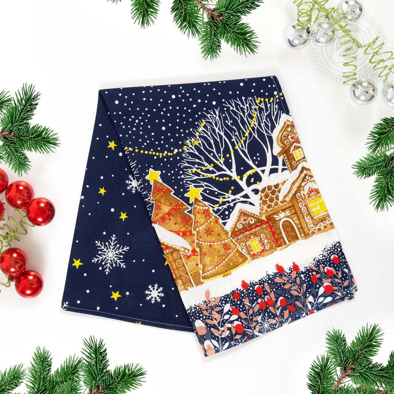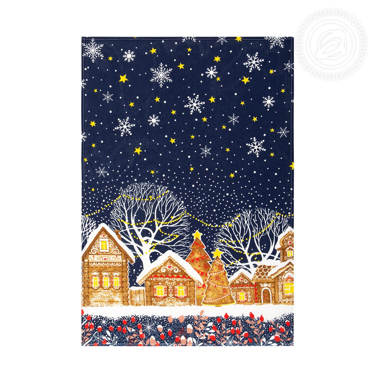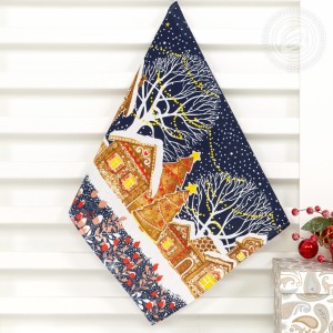 На новогоднем полотенце из рогожки изображена великолепная улица, словно из старых добрых сказок. Избы с резными ставнями, ёлочки с шариками и звездами, красивые снежинки, парящие в ночной мгле, - волшебный дизайн создает атмосферу уюта, тепла и ощущение праздника.