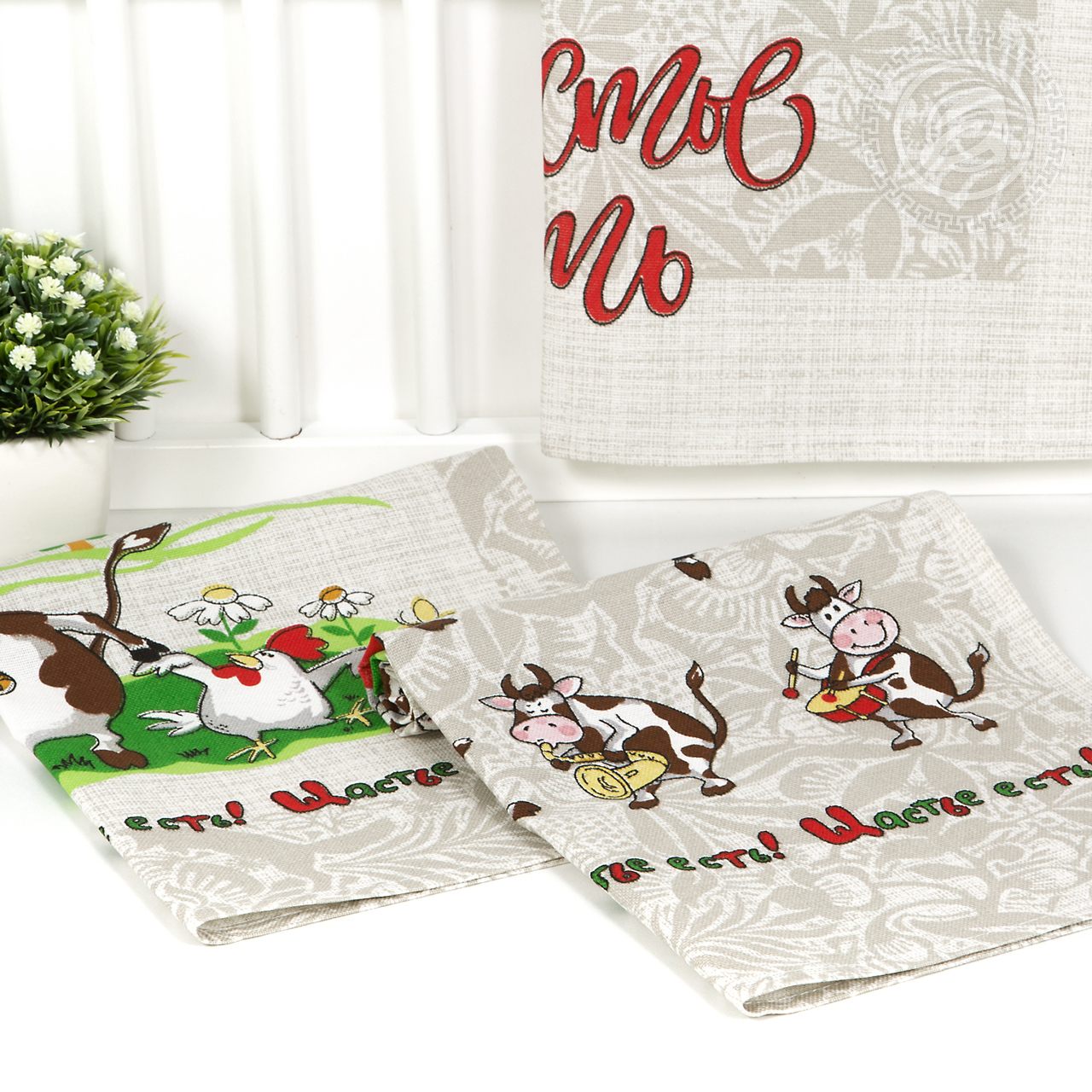 Кухонные полотенца из рогожки «Счастье есть» не просто незаменимый предмет обихода. Это яркий и стильный аксессуар с авторским дизайном.