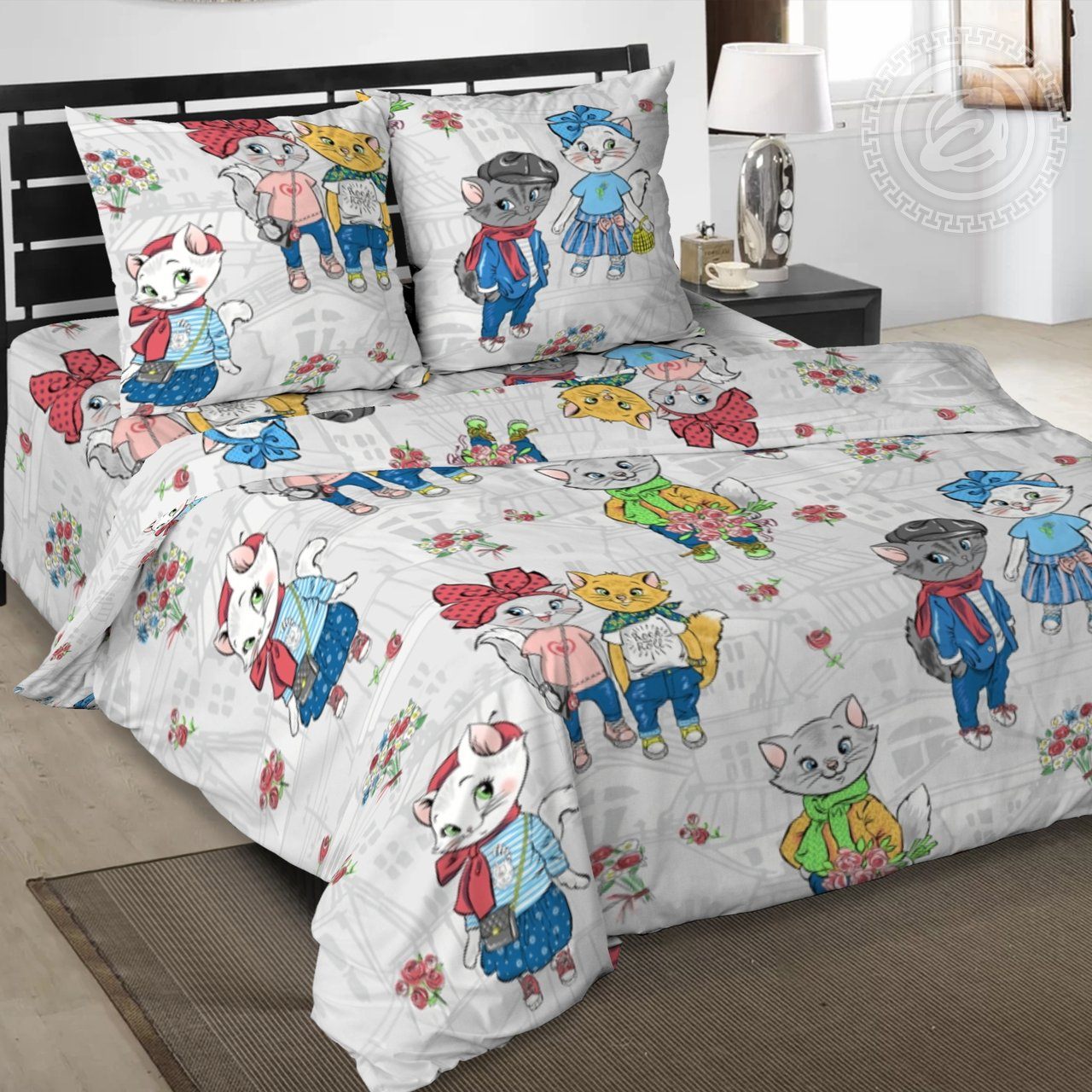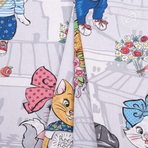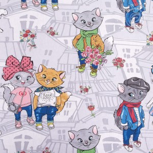 На ткани поплин прелестный дизайн с милыми котятами. Здесь и настоящие стиляги в костюмчиках, и галантные романтики с букетами цветов, и очаровательные модницы с разноцветными бантами.