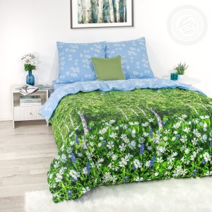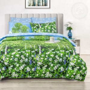 «Белая березонька» – настоящий символ русской культуры. Она олицетворяет собой красоту, грацию, мудрость и тесно связана с обычаями и традициями. На ткани поплин оптом от производителя изображена березовая роща, окруженная зеленью и цветами. На ткани-основе представлен лес с полем из нежных ромашек. А ткань-компаньон в голубом цвете символизирует чистое небо, которое гармонирует с природным пейзажем.
