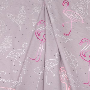 На ткани поплин собственного производства – трендовый рисунок в виде воздушных листочков и нежных фламинго, выполненных в контурном стиле. Белые, розовые и фиолетовые птички – яркий акцент на однотонном пудровом фоне.