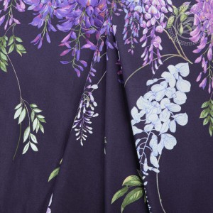 Глициния – чудесный цветок, о котором слагают легенды. Он символизирует нежность и женственность, хрупкость и красоту. Великолепные цветы-глицинии в насыщенной оттенками композиции появились и на ткани поплин, олицетворяя изысканность и элегантность. Рисунок выглядит по-летнему ярко и эффектно.