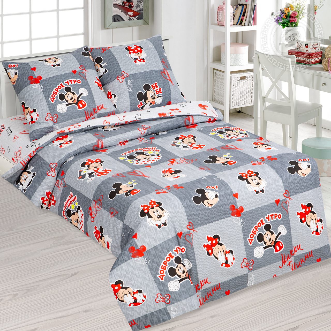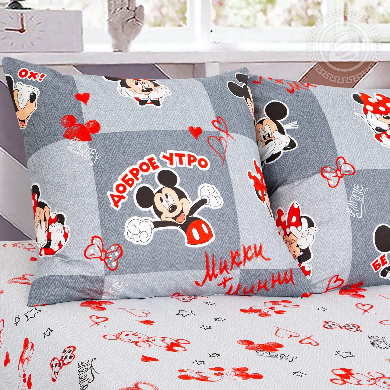 Микки и Минни снова вместе. На ткани поплин для детского постельного белья сладкая парочка любимых героев, которые всегда дарят радость. Модная Минни и озорной Микки то смеются, то о чем-то мечтают, то желают всем «Спокойной ночи». Композиция дополнена квадратами, звездами, сердечками и милыми надписями. Цвета спокойные и гармоничные.