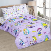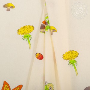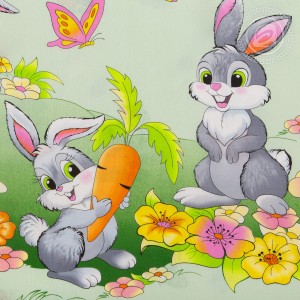 На постельном белье из поплина яркий и красивый дизайн с лесными зверятами. В центре композиции – милые и озорные серые зайчата, которые собирают морковку. А вокруг разноцветные душистые цветы, летние ягодки и бабочки, порхающие среди трав.