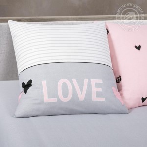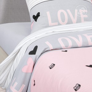 Весьма необычным является новый рисунок на ткани под названием «Гламур». Изображение определенно имеет свой стиль: розовый фон, на котором будто разбросаны маленькие черные сердечки и милые совята, серая лента с надписью крупными буквами LOVE, и бело-серые полоски наверху. Стильное решение для комплекта постельного белья. На такую покупку могут решиться современные молодые люди и разнообразить привычные изображения более старшее поколение. В любом случае, сочетание цветов приятно радует глаз, а общая композиция необычная и стильная.