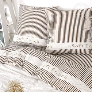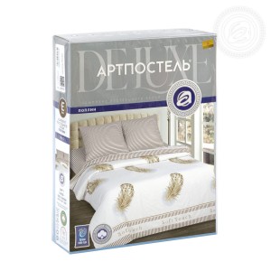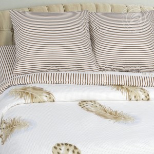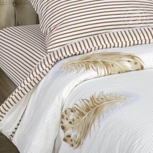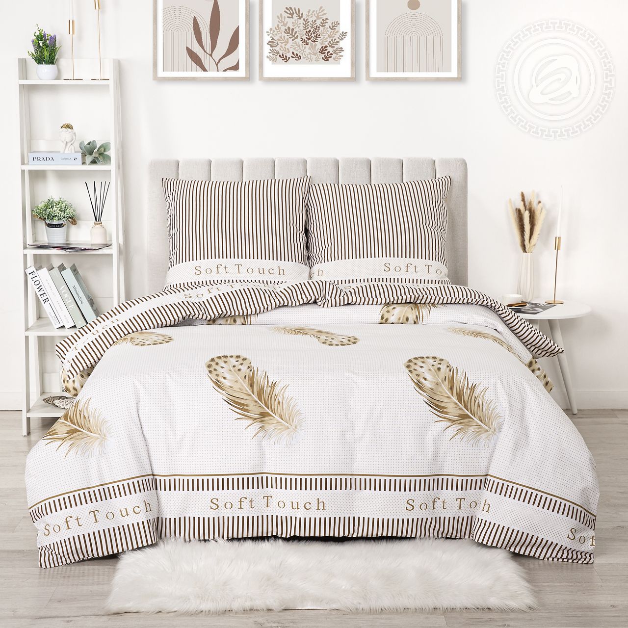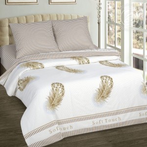 Кремово-пастельный фон рисунка заполнен сплошным точечным орнаментом. На нем свободно располагаются изящные легкие перья, выполненные в оттенках бежевого и шоколадного цвета. Бордюр рисунка отделен тонкой светло-коричневой линией и очень короткими вертикальными полосками, повторяющимися сверху и снизу. Посередине бордюра – декоративная надпись на английском «Soft Touch» - «нежное прикосновение».