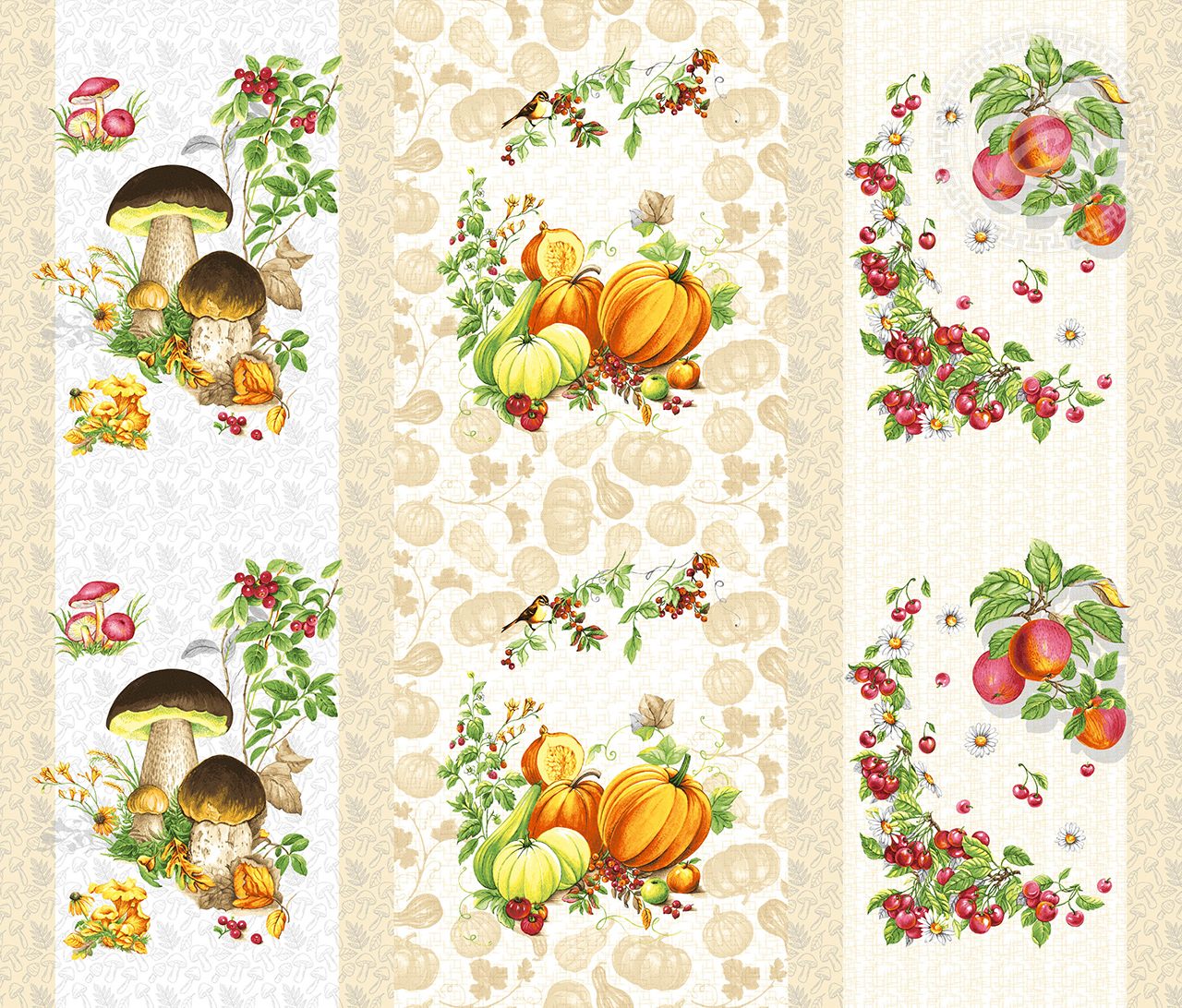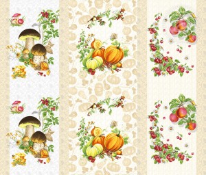 «Дары осени» – теплый и уютный дизайн на ткани рогожка. Он окутывает радостью и приятными воспоминаниями о лете. Перед нами несколько зарисовок с урожаем. Вот и яркие тыквы, и ароматные яблоки, и спелая вишня, и белые грибочки. Хочется любоваться всем этим богатством и ждать следующий удачный сезон. Рисунок в осенней гамме создает очень приятное впечатление и вызывает улыбку.