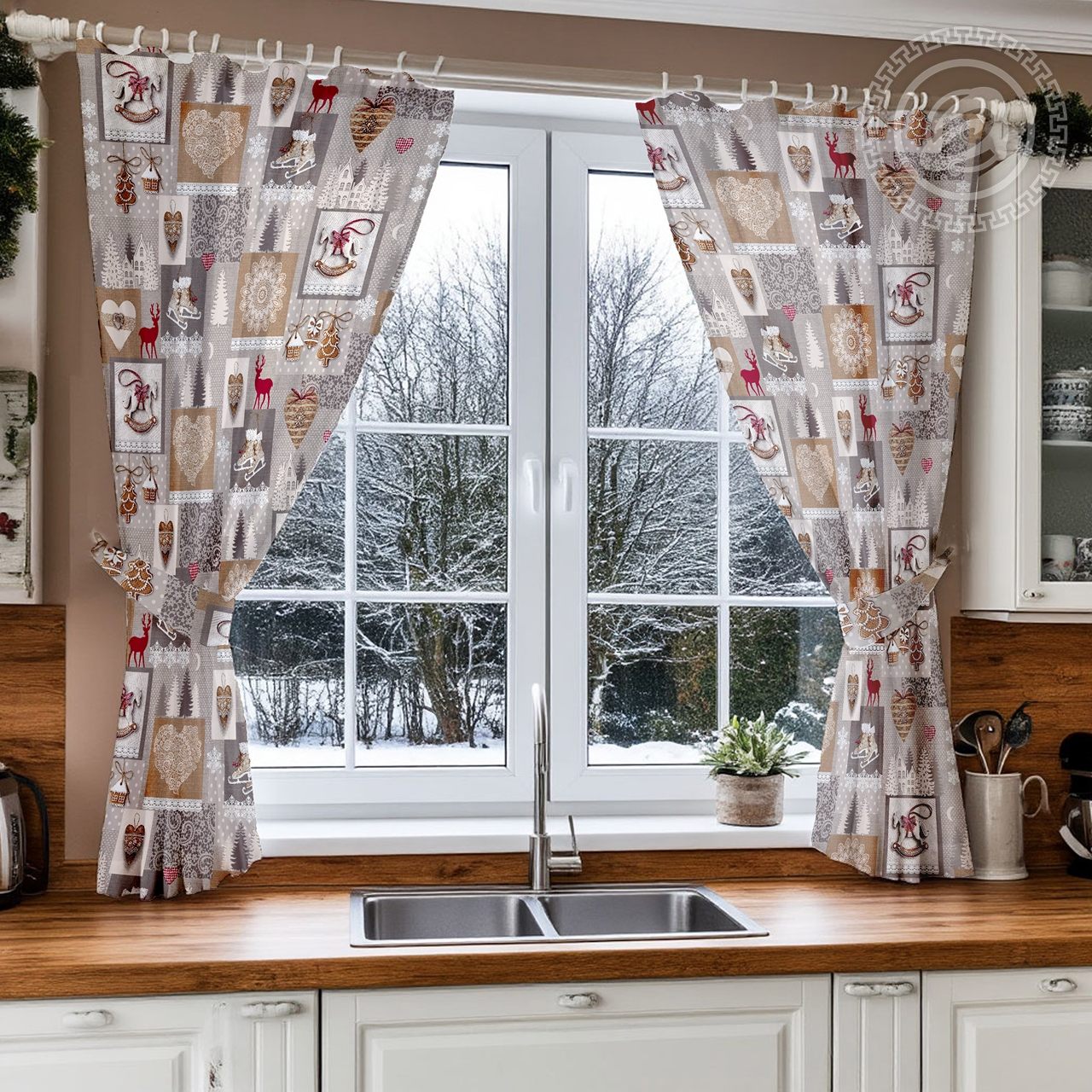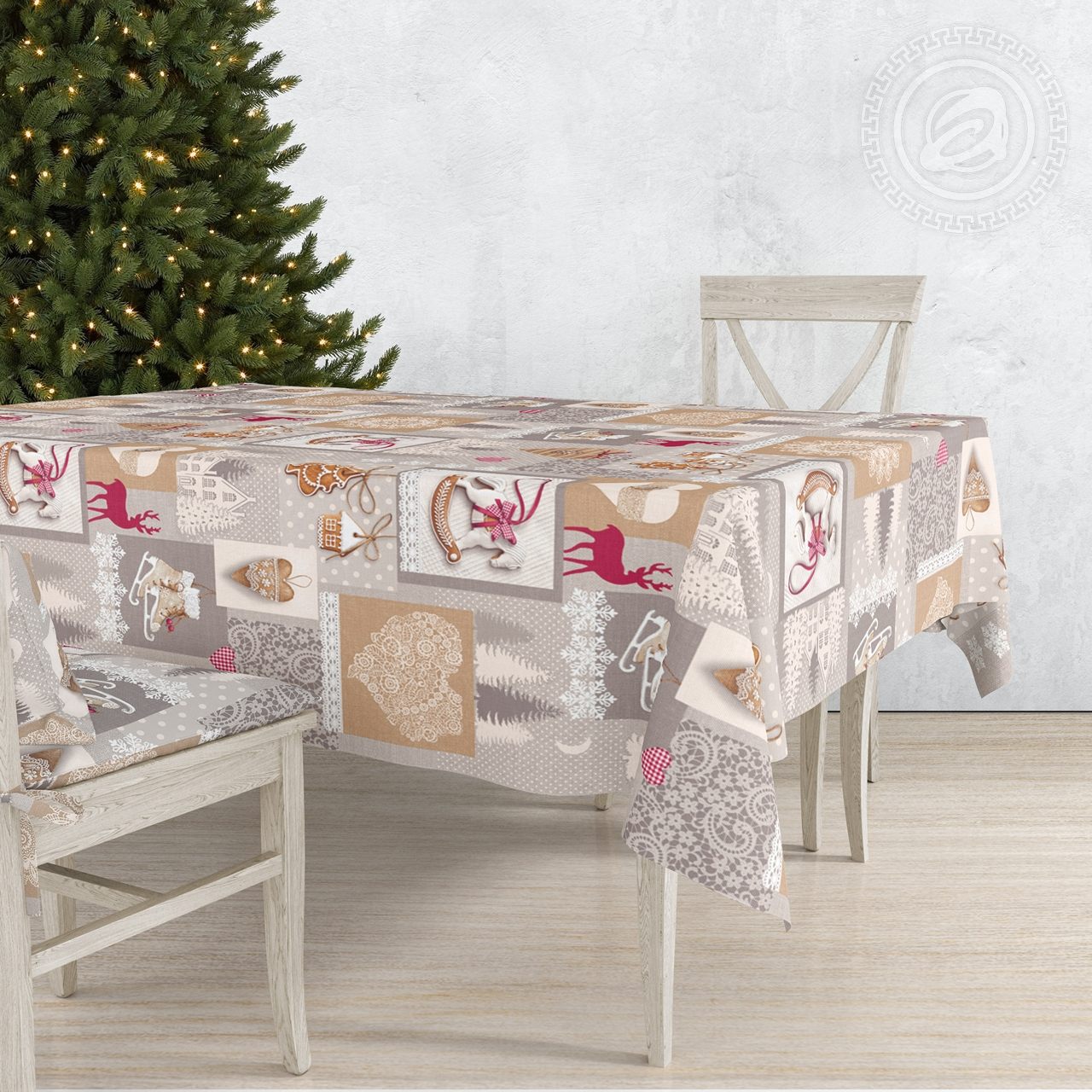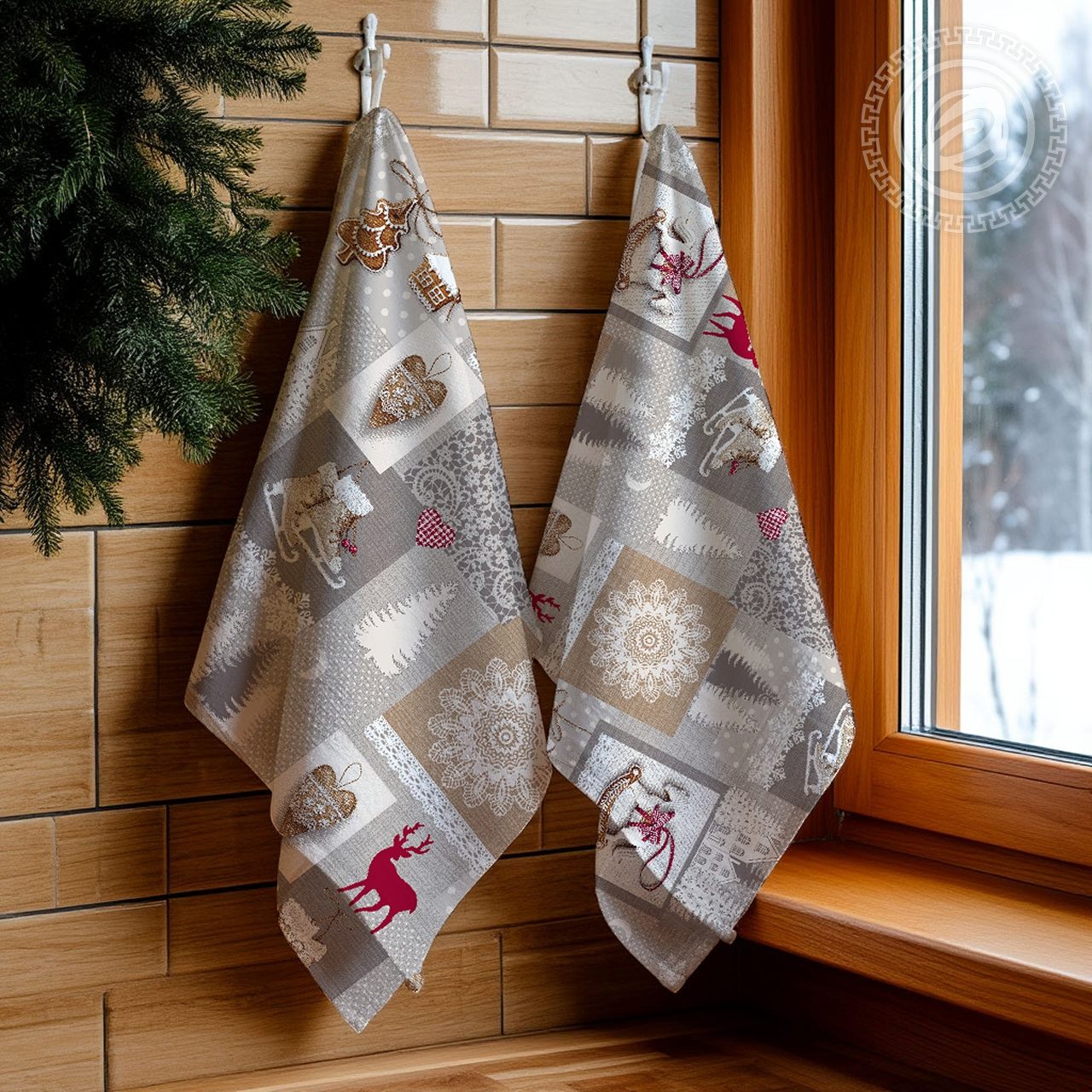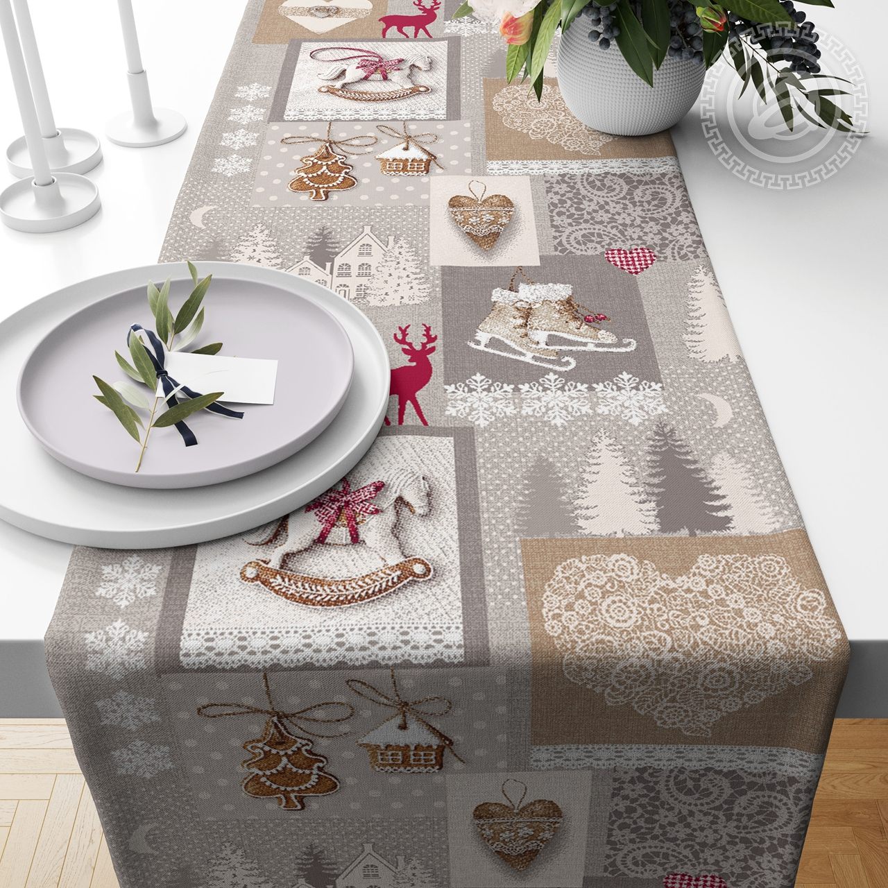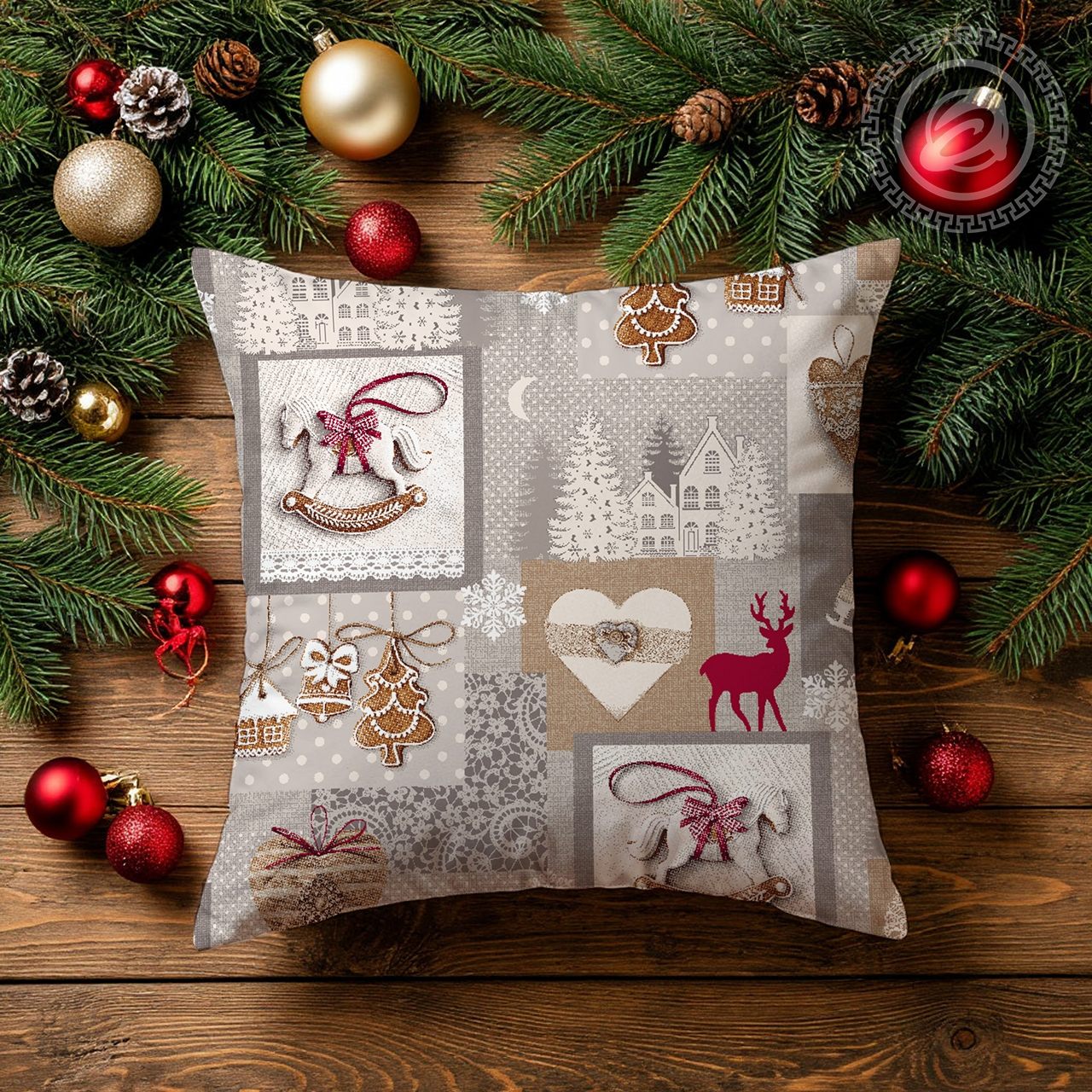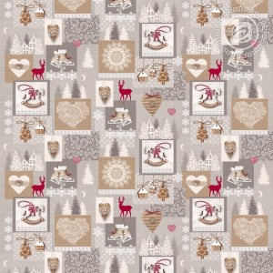 Рисунок изделия предоставляет широкий простор для фантазии. Спокойные серо-белые тона зимнего пейзажа органично сочетаются с красочными изображениями атрибутов Нового года. Фигурные коньки, резные узоры мороза на оконном стекле, пряничные елочные подвески. Ощущение близкого праздника дарит вам рисунок на ткани.