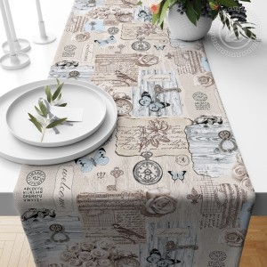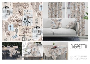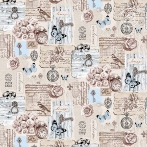 Новый рисунок на рогожке под названием «Либретто» насыщен и разнообразен в своем содержании: здесь можно увидеть деревянные двери со старинными ручками, отрывки из писем с рисунками, часы, букеты роз или единичные розочки, ключики и бабочки. Причем если в основном цвет всего изображения является бледно-розовым, то некоторые элементы окрашены в нежно-голубой цвет. Такое сочетание дополняет друг друга, принося некоторый акцент одного цвета на другой. Ткань выполнена качественно, а рисунок добавляет эстетической красоты и уникальности.