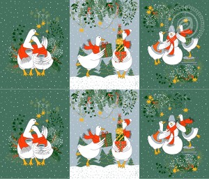 На ткани рогожка «Почудим» новогодний принт с очень добрым и уютным дизайном. Здесь сцены из жизни милых гусей обнимусей. Наша парочка дни напролет проводит вместе: за чашечкой чая и прогулкой по зимнему парку, подготовкой подарков и лепкой снеговика. Палитра яркая и красочная, а рисунок – атмосферный и праздничный. Он пропитан магией Нового года и домашнего тепла.