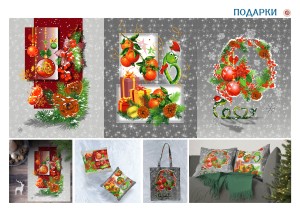 Мы собрали все атрибуты праздника в новом дизайне «Подарки» на ткани рогожка. На рисунке яркий коллаж с разными деталями. Вот ароматные мандарины, вот еловые шишки, подарки с ленточками и символ года – веселая змейка.