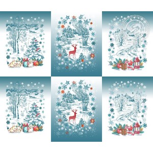 «Синей иней» — это ткань с новогодним рисунком, который окутывает атмосферой волшебства и сказки. Зимний пейзаж выполнен в бело-голубых оттенках, а все атрибуты праздника красные и золотые.
