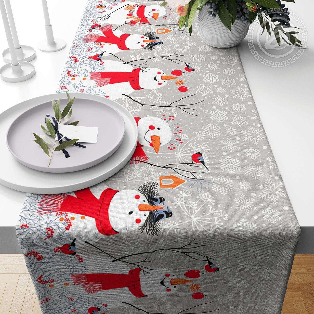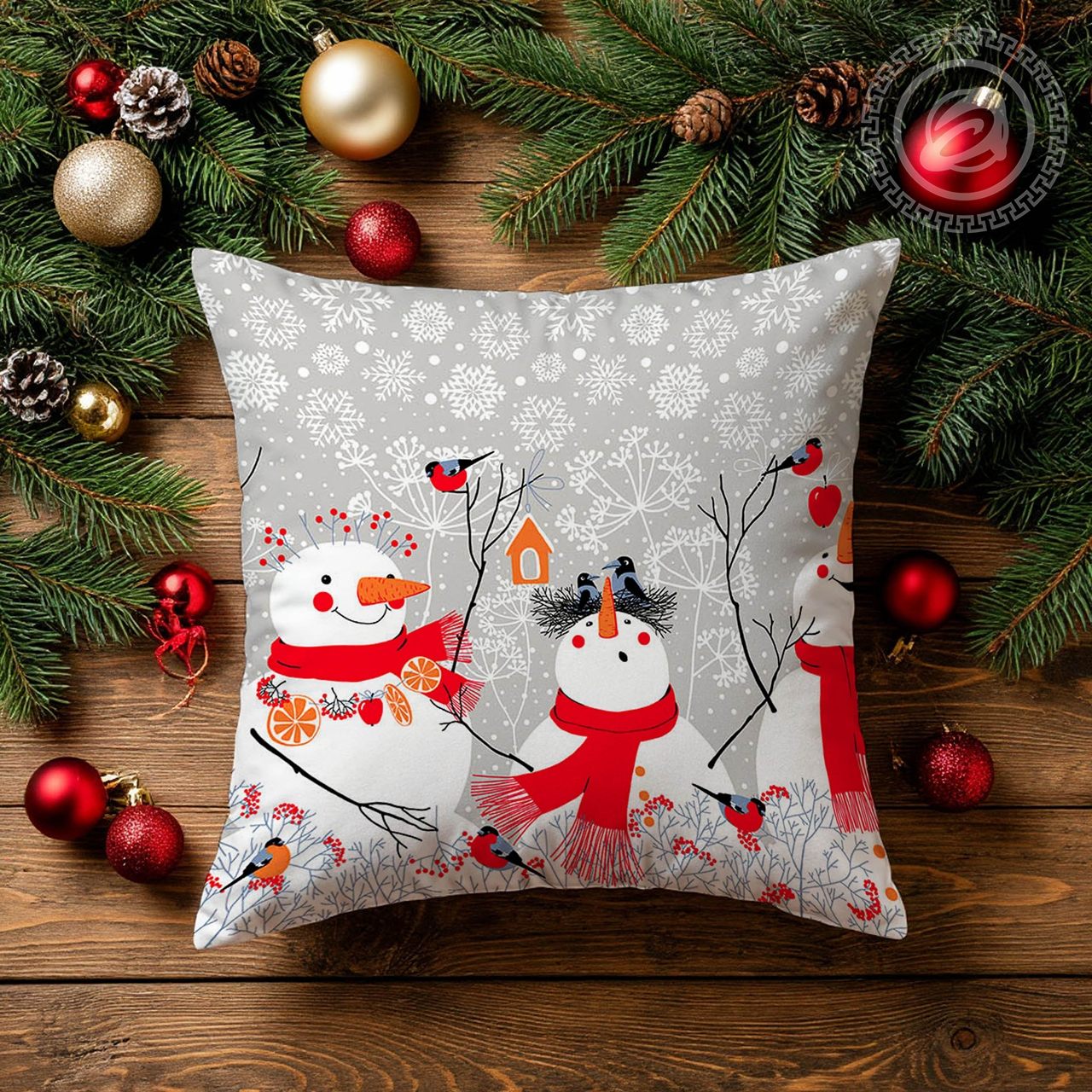 «Снеговики» дарят новогоднее настроение. На рогожке очаровательный зимний рисунок с пушистыми снежинками, забавными снеговиками, милыми снегирями не ветках. Композиция выполнена в гармоничных и спокойных цветах. Новогодний дизайн несет домашний уют и радостное ожидание чудес и сказки.