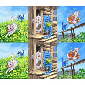 Милые и забавные котики – главные звезды дизайна «Твикс». На ткани рогожка яркие зарисовки из жизни влюбленной парочки, которые полны романтики, беззаботности и веселья. Усатый-полосатый восхищается своей прекрасной дамой, приглашает ее на свидания и дарит букеты полевых цветов. Красочный рисунок с мартовскими котиками создаст позитивное настроение на кухне.