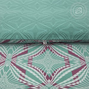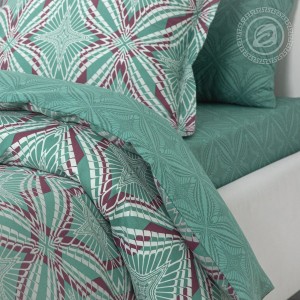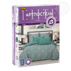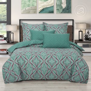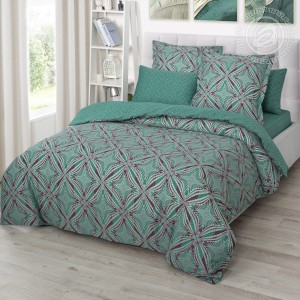 На комплекте «Джон», выполненном из мягкой и гладкой премиальной ткани «сатин», представлен геометрический рисунок в виде ромбов. Общая композиция выполнена в оттенках зеленого цвета и дополнена акцентными линиями. Авторский рисунок завораживает и добавляет в окружение утонченные и элегантные нотки.