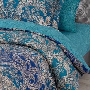«Серебряные нити» — это великолепный образ роскоши и шика. Ткань сатин оптом в модной расцветке и с орнаментом в виде золотых узоров и вензелей очень элегантна и изящна. Такая композиция станет изысканным и богатым украшением спальни.