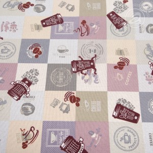 Каждое утро должно непременно начинаться с хорошего настроения. Для многих это зависит от выпитой с утра чашечки кофе. Новый рисунок на ткани из рогожки под названием «Эспрессо» полностью поддерживает данное утверждение. На полотне неярко обозначен фон, который состоит из клеточек разных цветов с изображением чашек, надписей и эмблем кофейных компаний. А поверх уже яркими красками прорисованы в основном стаканчики, некоторые из них даже могут бегать. Маленькие чашечки с зернами добавляют пикантности общей композиции. Рогожка на кухне – это необходимость, а интересный и стильный рисунок на ней– сплошное удовольствие!