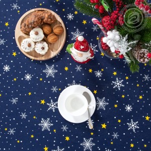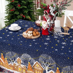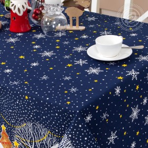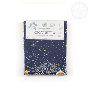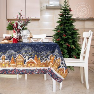 На новогодней скатерти из рогожки изображена великолепная улица, словно из старых добрых сказок. Избы с резными ставнями, ёлочки с шариками и звездами, красивые снежинки, парящие в ночной мгле, - волшебный дизайн создает атмосферу уюта, тепла и ощущение праздника.