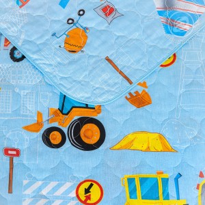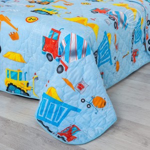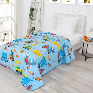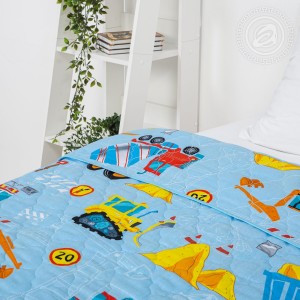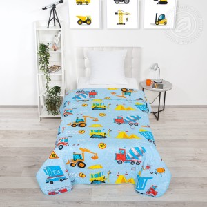 «Строитель» - суперхит для детской комнаты. На покрывале яркая композиция, выполненная в красных, желтых, оранжевых и голубых цветах. На рисунке - грузовики и тракторы возят песок и строят дорогу. Мальчишки будут с удовольствием рассматривать детали красочного дизайна.