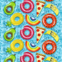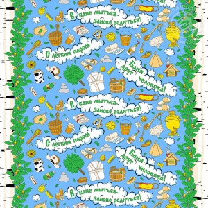 «Баня – друг человека», «В бане мыться – заново родиться», - забавные фразы украсили вафельное полотно с атмосферным дизайном. На ткани атрибуты банной традиции: веники и ушаты, халаты и мочалки, щетки и шапки, а главный гость – самовар. Бордюры украшены узорами в виде стройных берез и дубовых желудей.