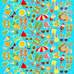 Солнце, море, пляж, - на вафельном полотне все атрибуты счастливого отпуска. Здесь и солнцезащитные очки, и разноцветные зонтики, и пляжные сумки, и яркие сланцы.
